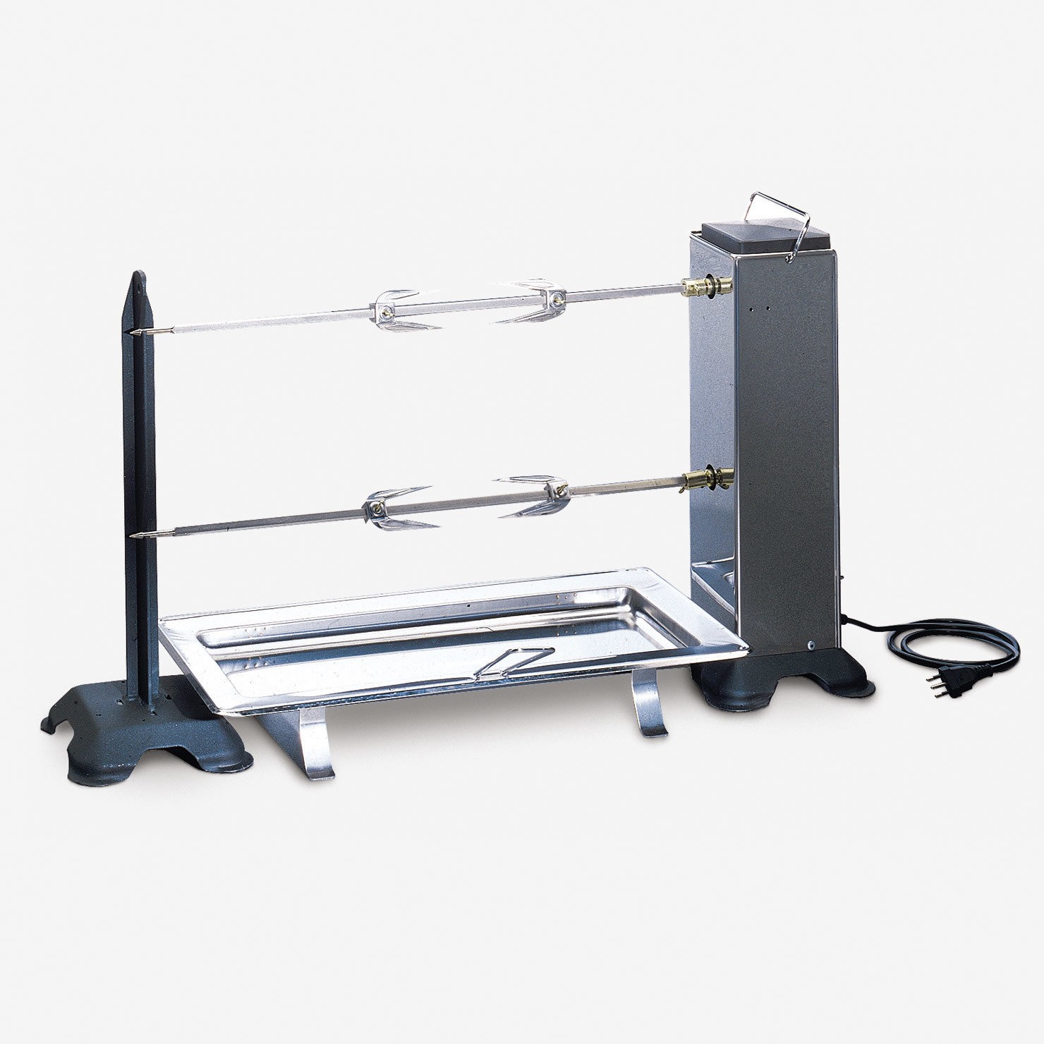 893120050Asador para asar grandes pedazos de carne o pescado, con capacidad de hasta 15 kg. Autoportante, con dos motores accionables individual o simultáneamente, está equipado con dos varillas cuadradas de acero inoxidable de 8 mm y 66 cm de largo y una grasera siempre de acero inoxidable.